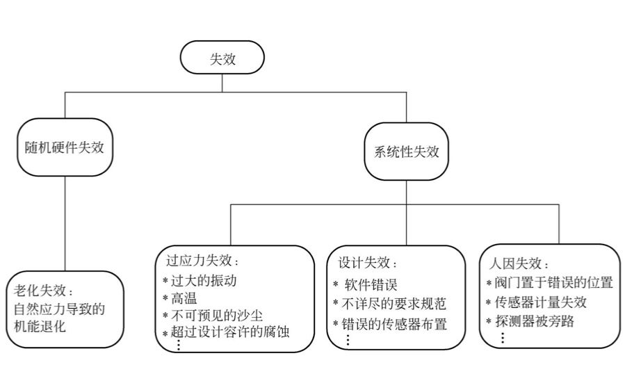 兩者最根本的區(qū)別是:發(fā)生物理失效的設(shè)備根本不能執(zhí)行功能,而發(fā)生系統(tǒng)性失效的設(shè)備是能夠操作的,但不能執(zhí)行其預(yù)定的功能。IEC61508-4也將E/E/PE安全相關(guān)系統(tǒng)的失效分為隨機(jī)硬件失效和系統(tǒng)性失效,但該標(biāo)準(zhǔn)定義的隨機(jī)硬件失效只指由于機(jī)能退化而導(dǎo)致的隨機(jī)硬件失效,而不包含由于過(guò)大環(huán)境應(yīng)力而導(dǎo)致的設(shè)備失效。但是兩年后發(fā)布的IEC61508-6使用“硬件失效”沒(méi)有“隨機(jī)”二字,而且IEC61508-6附錄D中描述共因失效可能源于設(shè)計(jì)或規(guī)范等系統(tǒng)錯(cuò)誤或外部應(yīng)力導(dǎo)致的隨機(jī)硬件失效,這里的隨機(jī)硬件失效的范疇與原定義不同,包含了外部應(yīng)力導(dǎo)致的硬件失效。這里仍然沿用IEC61508-4的分類(lèi),并對(duì)系統(tǒng)性失效進(jìn)一步分類(lèi),如圖3所示。